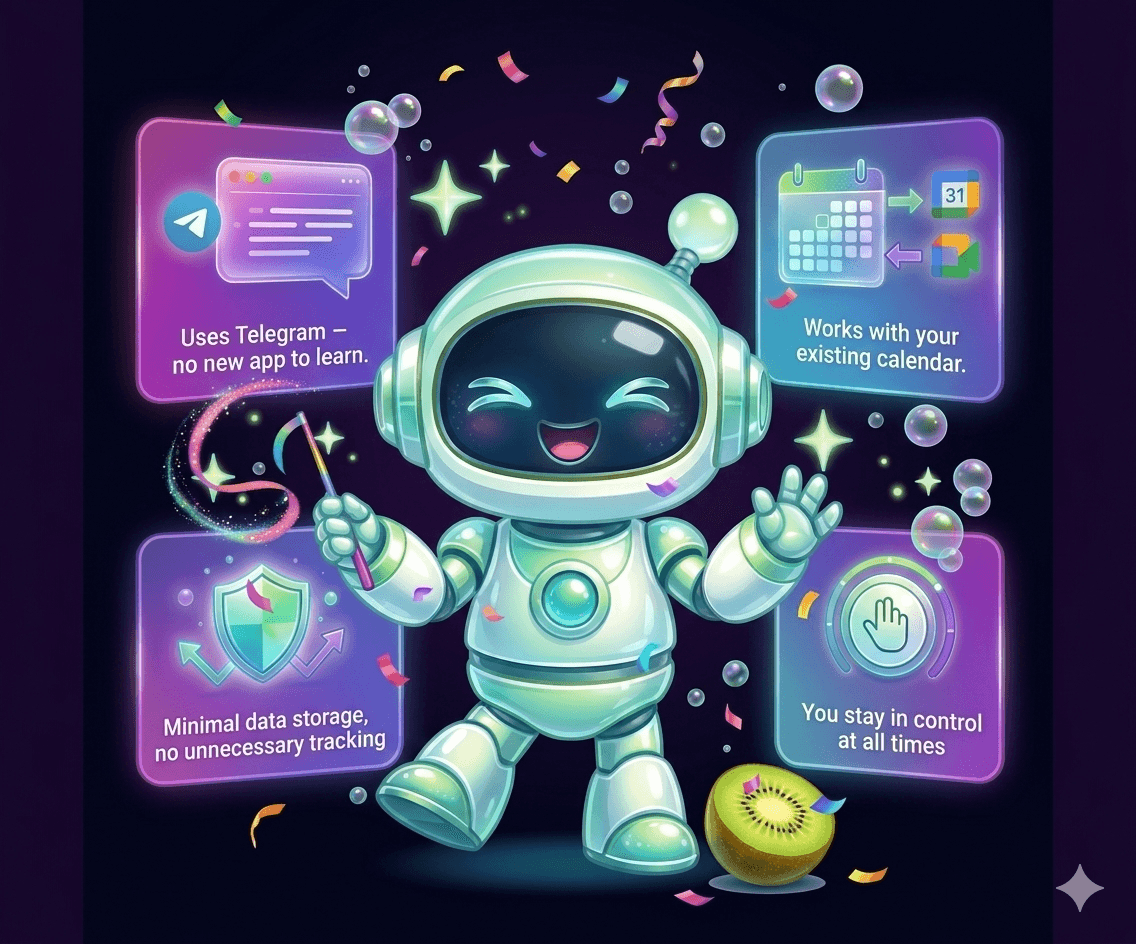 Use your existing Telegram account. No new app to download or learn. Just connect and you're ready.